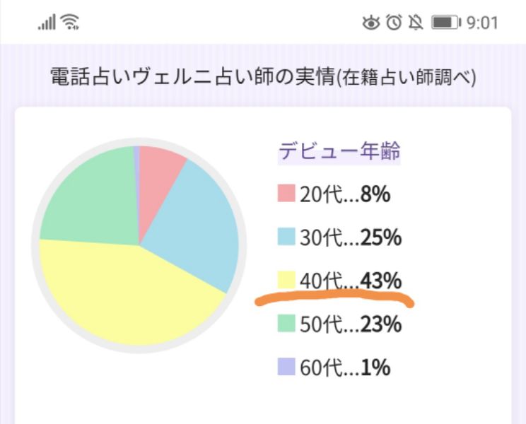 特に電話占い師は40代の落ち着いた女性が多いですね。下記の図は電話占いヴェルニの在籍占い師データです。